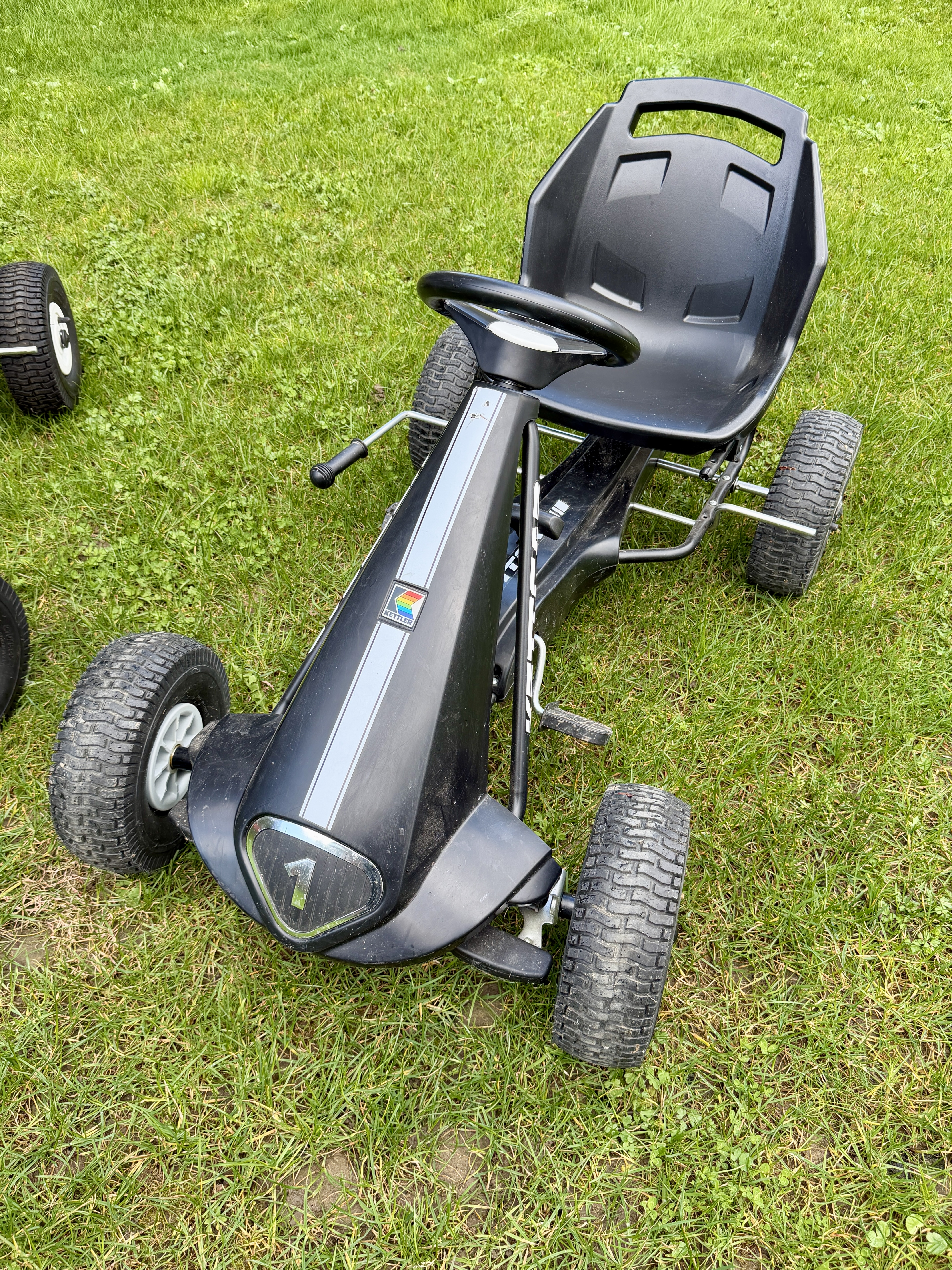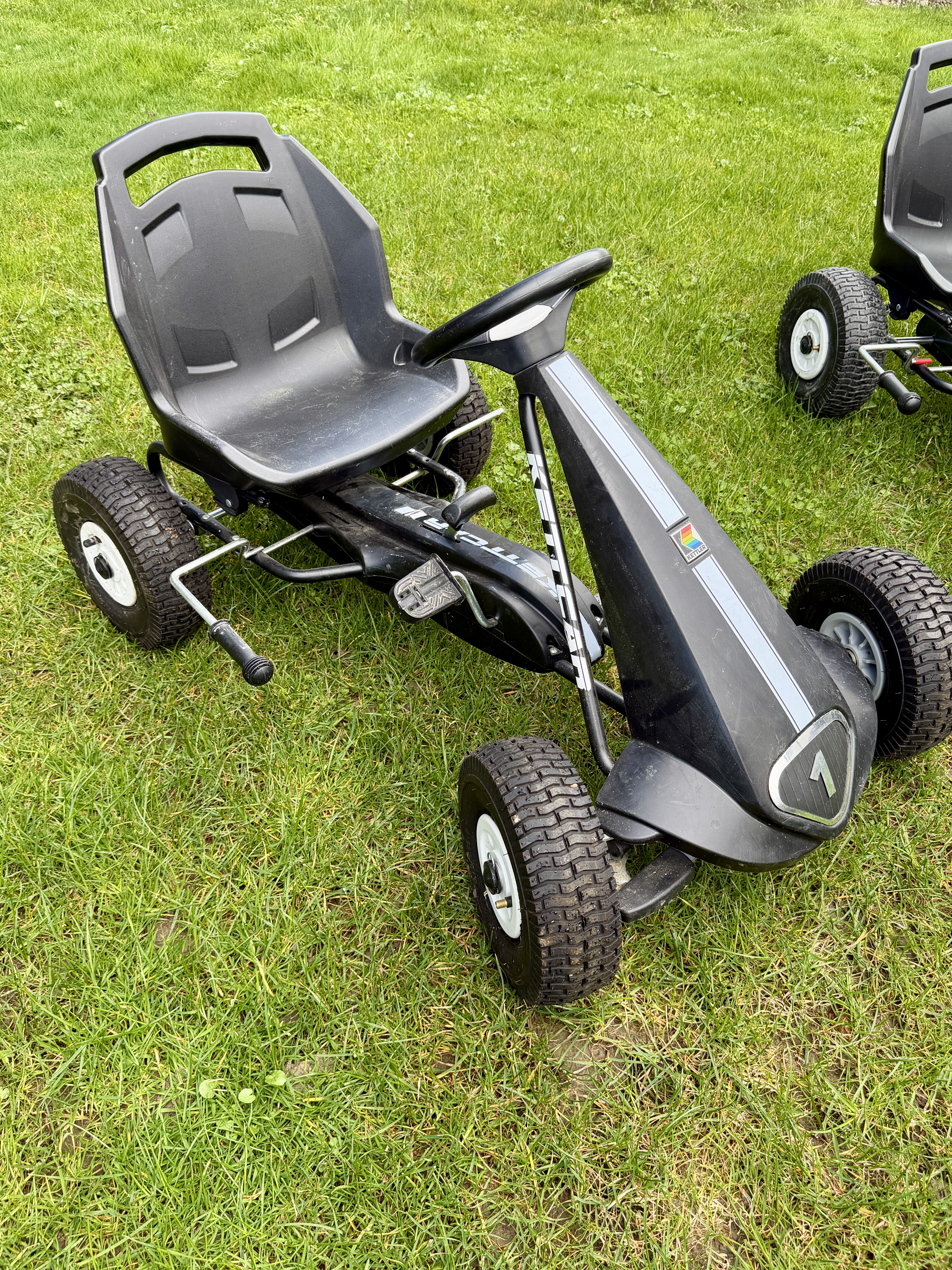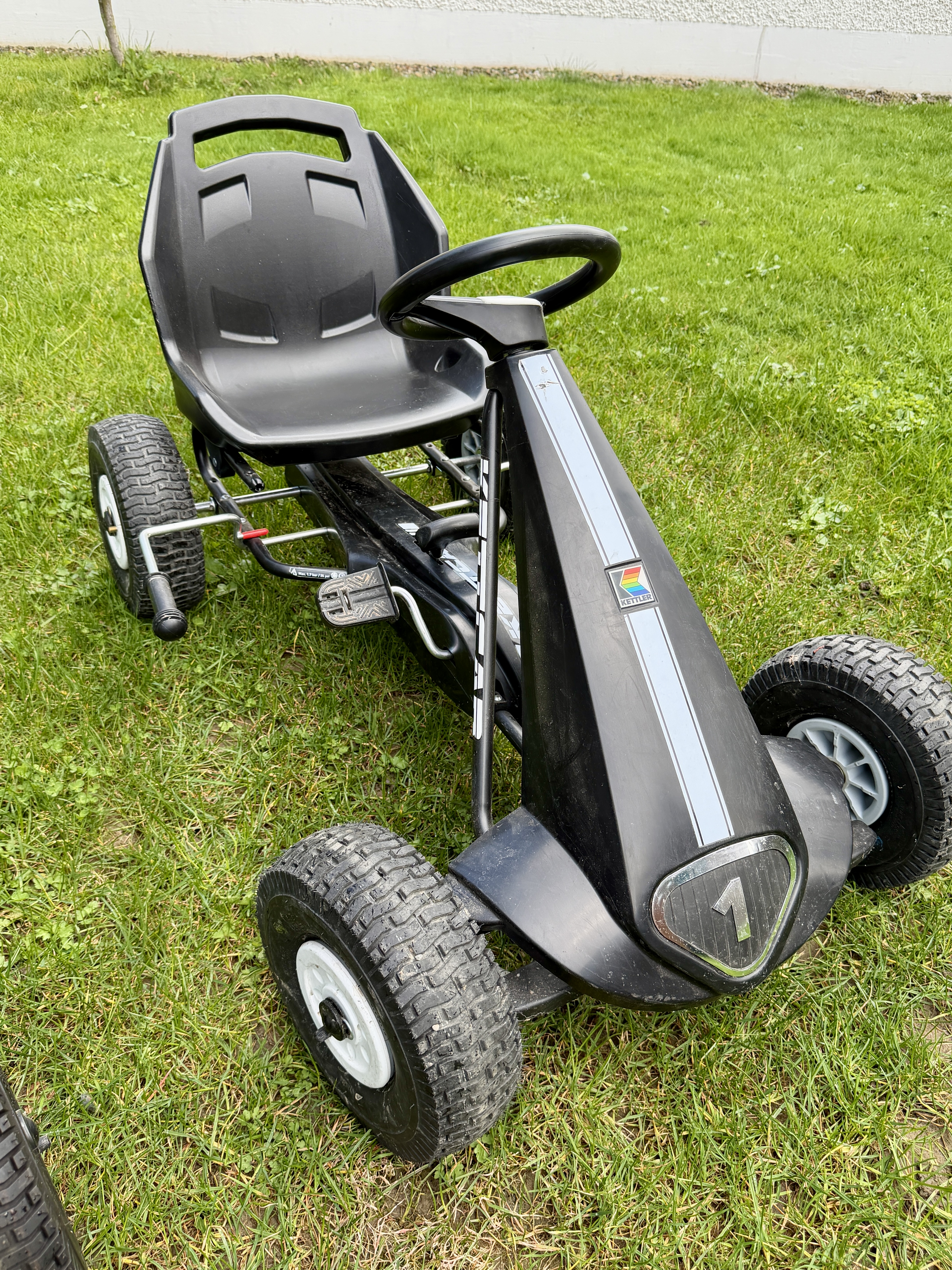 Die beliebten Kinder-Gokarts sind robust gebaut und sorgen dank Luftreifen und verstellbarem Sitz für viel Fahrspass.